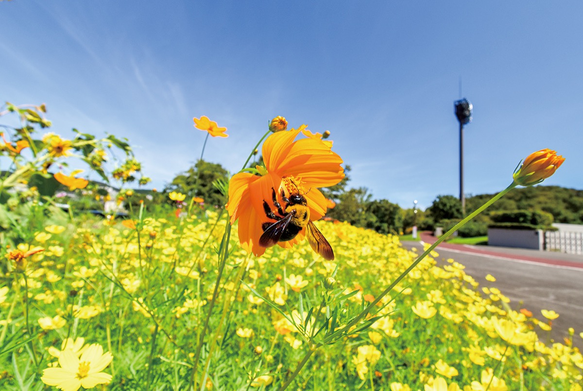 荻野運動公園(厚木市中荻野1500)の駐車場近くでキバナコスモスが見頃になった。鮮やかな花から花へ蝶や蜂が飛び、来場者がスマホを構える。花言葉は「野性的な美しさ」。