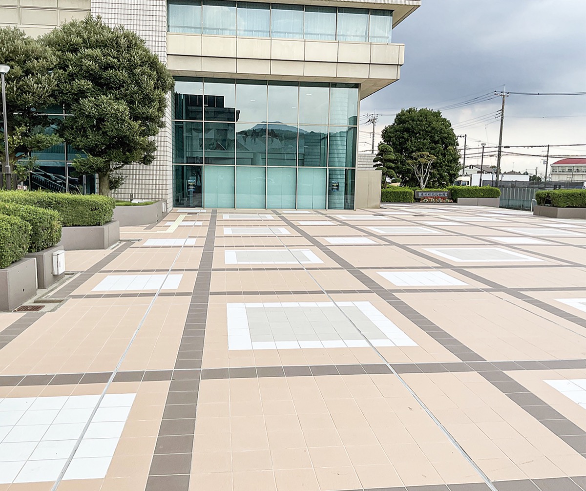 愛川町文化会館外の「かえで広場」の床タイルが張り替えられ一新された。これまでのレンガ調のものから、明るいベージュに変更された。