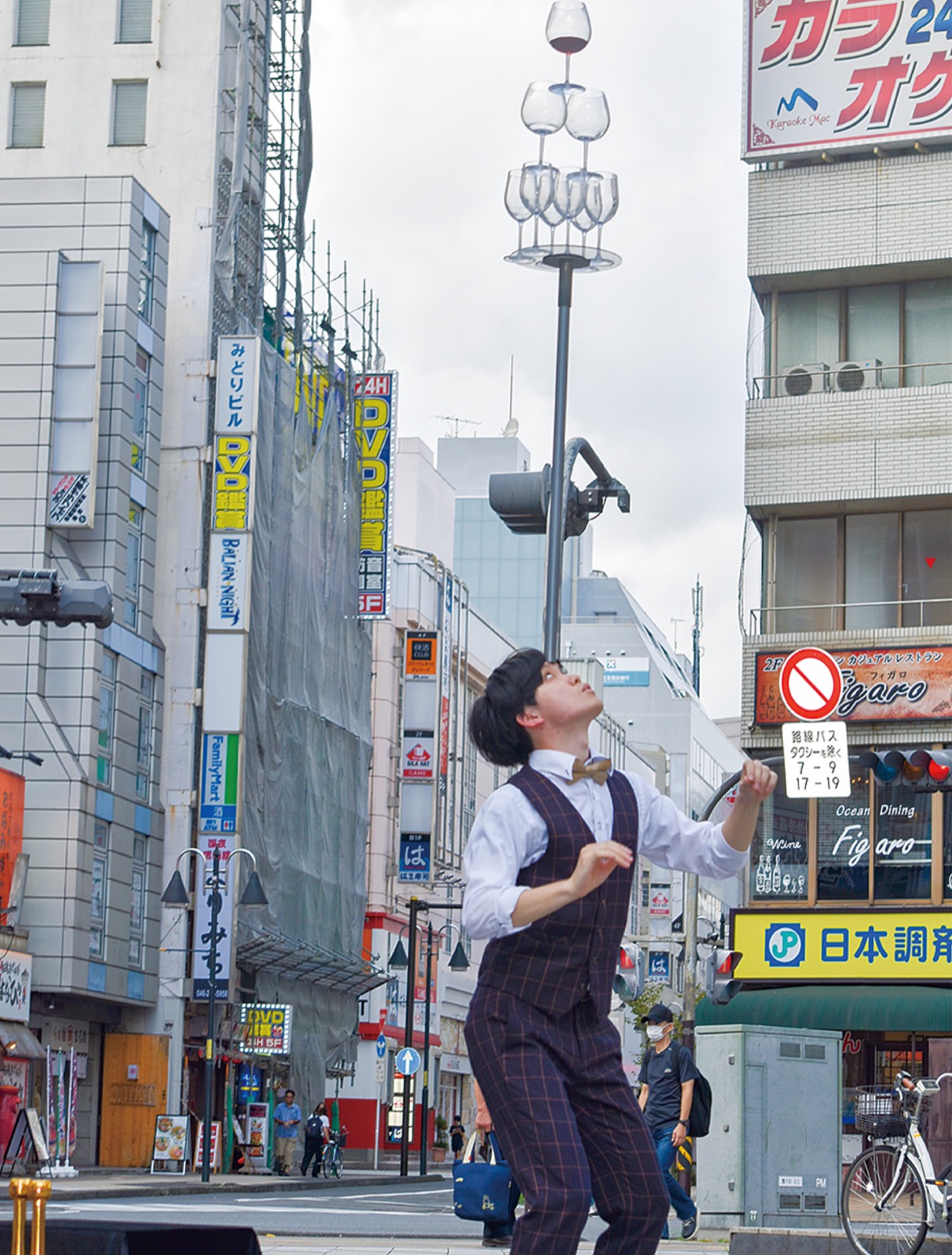 ワイングラスを重ねて額に載せているのは、平塚市在住の大道芸人・ハタダさん(26)。芸歴7年で、普段は都内を中心に活動している。公園では手際よく長短の棒を空中で舞わせたりと、緊張感を織り交ぜたジャグリングを披露し、周りからBGMにあわせて手拍子のリズムも。汗だくになり「人通りが少なめと思ったけれど、厚木は地元の人が多く、雰囲気がいい」と笑顔を見せていた。この日は「パペット落語」で活躍する笑福亭鶴笑一座も登場し、会場を盛り上げた。