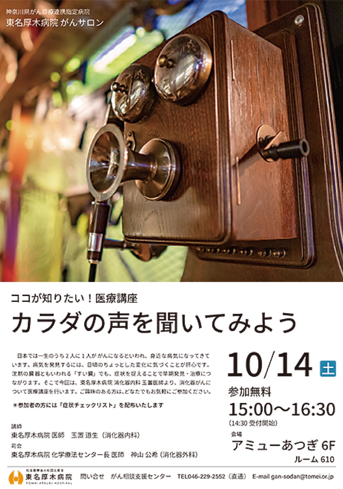 社会医療法人社団三思会東名厚木病院のがんサロン「カラダの声を聞いてみよう」が10月14日(土)、厚木市中町のアミューあつぎ6階ルーム610で開催される。参加無料。時間は15時から16時半(14時半開場)。