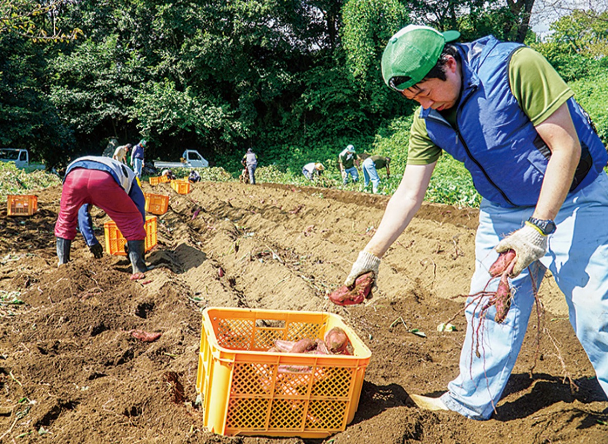 秋晴れの下9月26日、NPO法人里山ネット・あつぎの会員6人と黄金井酒造の社員6人が厚木市七沢にあるサツマイモ畑で芋の収穫を行った。