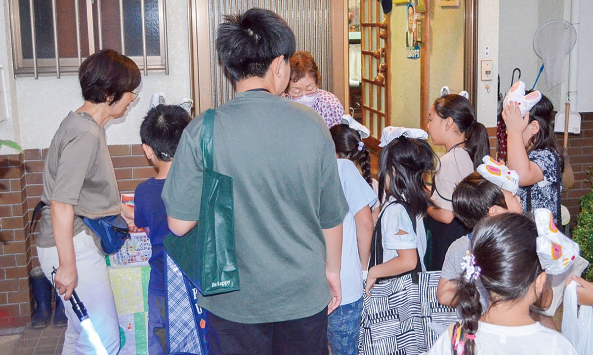 今年は4年ぶりに子どもたちの各家の訪問が復活。小学生と幼児約30人が同会館に集合。SGSゴーゴーのメンバーや保護者らと周って歩き、お菓子をもらっていった。