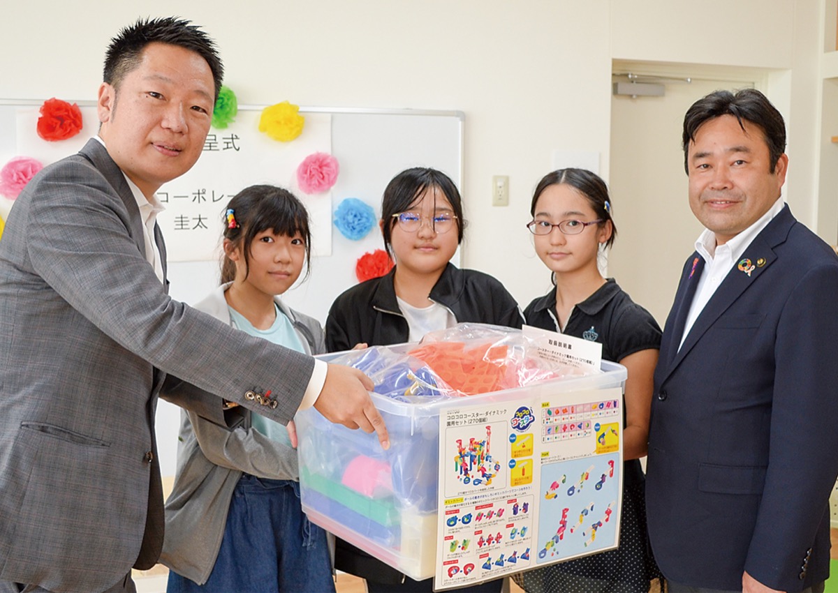 厚木市栄町の株式会社Kコーポレーション(小島圭太代表取締役)は9月27日、地域貢献活動の一環として、市内児童館全38施設に遊具や図書を寄付。厚木北児童館で贈呈式が行われた。