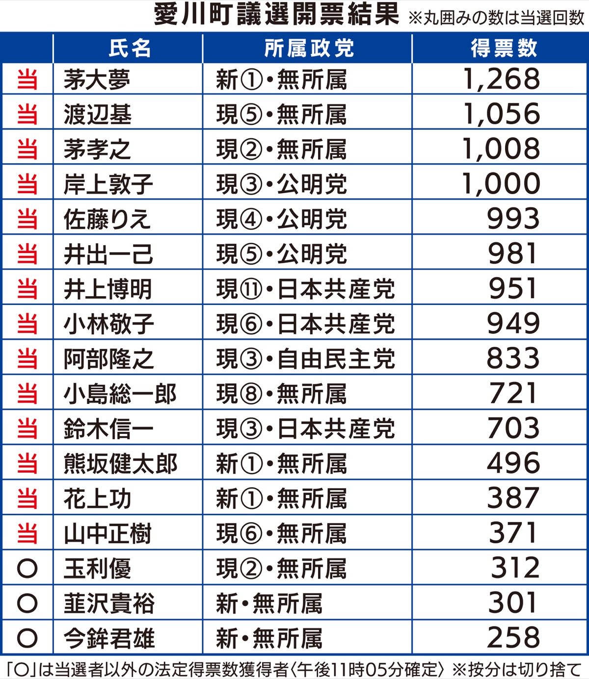 今年3月に可決した議員定数改正条例案で16人から14人になり初めての町議選は3人が引退し、現職12人、新人5人の17人が立候補した。当選者は現職11人、新人3人。党派別では公明党3議席、日本共産党が3議席、自由民主党が1議席を獲得した。