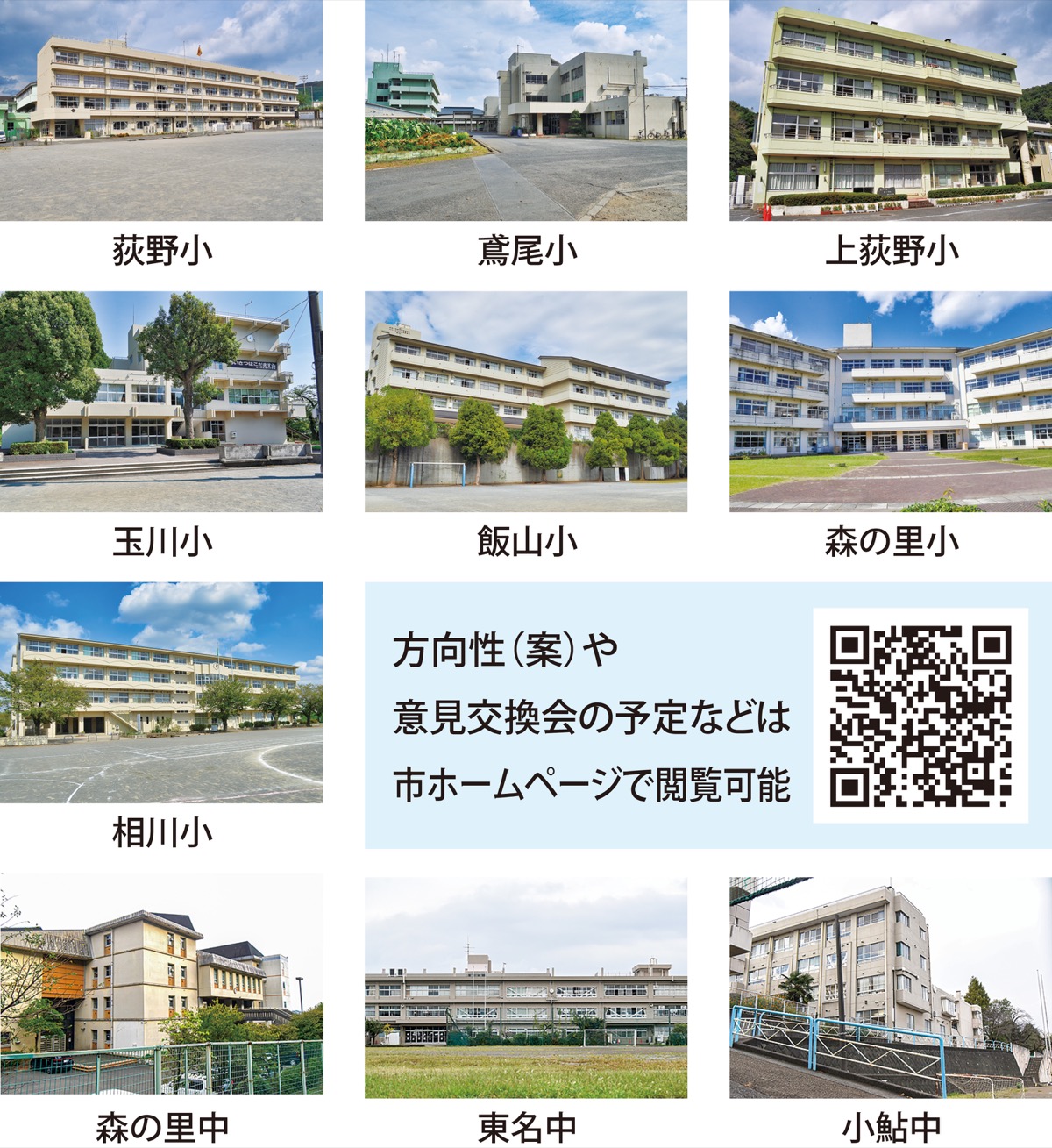 教育委では1〜2月に対象校の保護者や周辺住民など7360人にアンケートを実施。37%が回答し、クラス替えの必要性や通学負担への関心が浮き彫りになっていた。今後は案をもとに10月9日から5会場で計10回の意見交換会を開く。詳しくは市HP(「厚木市立小・中学校の適正規模・適正配置の方策の方向性」で検索)または上記二次元コード参照を。
