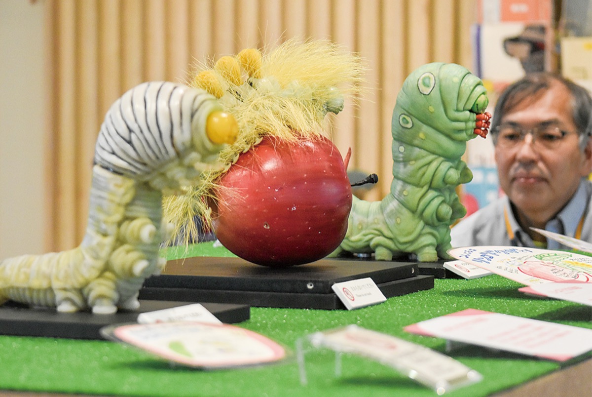 あつぎ郷土博物館(下川入)のホールに、現在イモムシの大型フィギュアが鎮座している。迫力あるこの3体は、蛾をテーマにした企画展の一部だ。幼虫の一例をモチーフにした作品で、よく見ると愛嬌たっぷりだ。展示室には同館が所蔵している標本に加え、専門家・山本光人氏の標本がずらり。「この素晴らしい標本の数々を、市民の皆さんに見せないわけにはいかない」と同館が初めて企画した。
