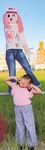 厚木市船子、小田急小田原線の線路沿いにある田んぼに、今年も園児たちのユニークな創作かかしが登場した=写真上。