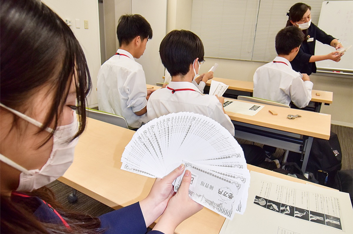 生徒たちは来店客として行員から投資信託について説明を受け、貸金庫の仕組みなどを見学。束になった模擬紙幣を数える体験もあった。若手の行員は必ず練習して習得しなければならない「札勘」と呼ばれるスキル。重ねて1枚ずつめくる縦読みや、半円形に広げる横読みがある。生徒からは「ヨレヨレになってしまった」「プリントの配布で使えそう」と懸命に取り組んでいた。