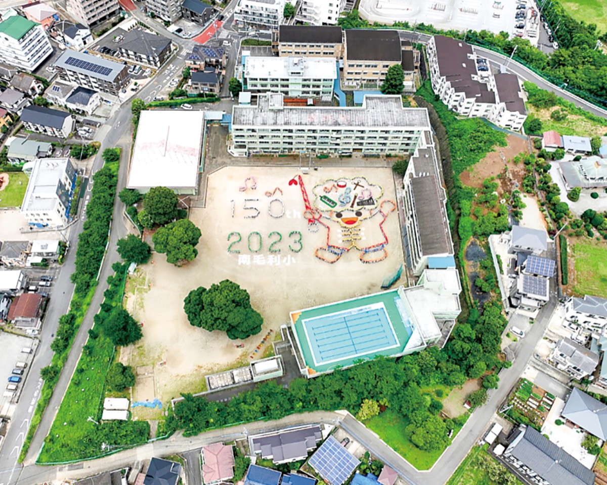 同校では6月に航空写真も撮影。児童が並んでキャラクター「鼓笛ちゃん」や「150」を描いたほか、8月には門柱板も新調した。