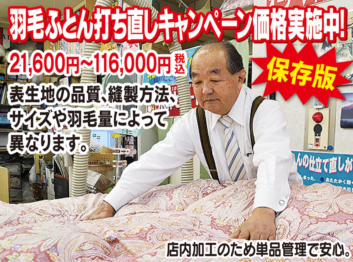 定評のオーダーメイド打ち直しは『表生地、縫製方法、柄、羽毛の品質、羽毛量、サイズ変更等』が自由で、長期間使える軽く温かいふとんに変身。買い替え検討の方には、店主自ら羽毛素材や側生地の違いをアドバイス。相談に乗ってくれる。集配に加え生地見本持参の訪問も可能だ。