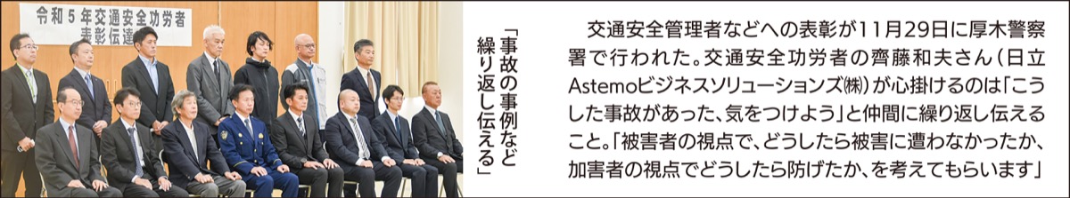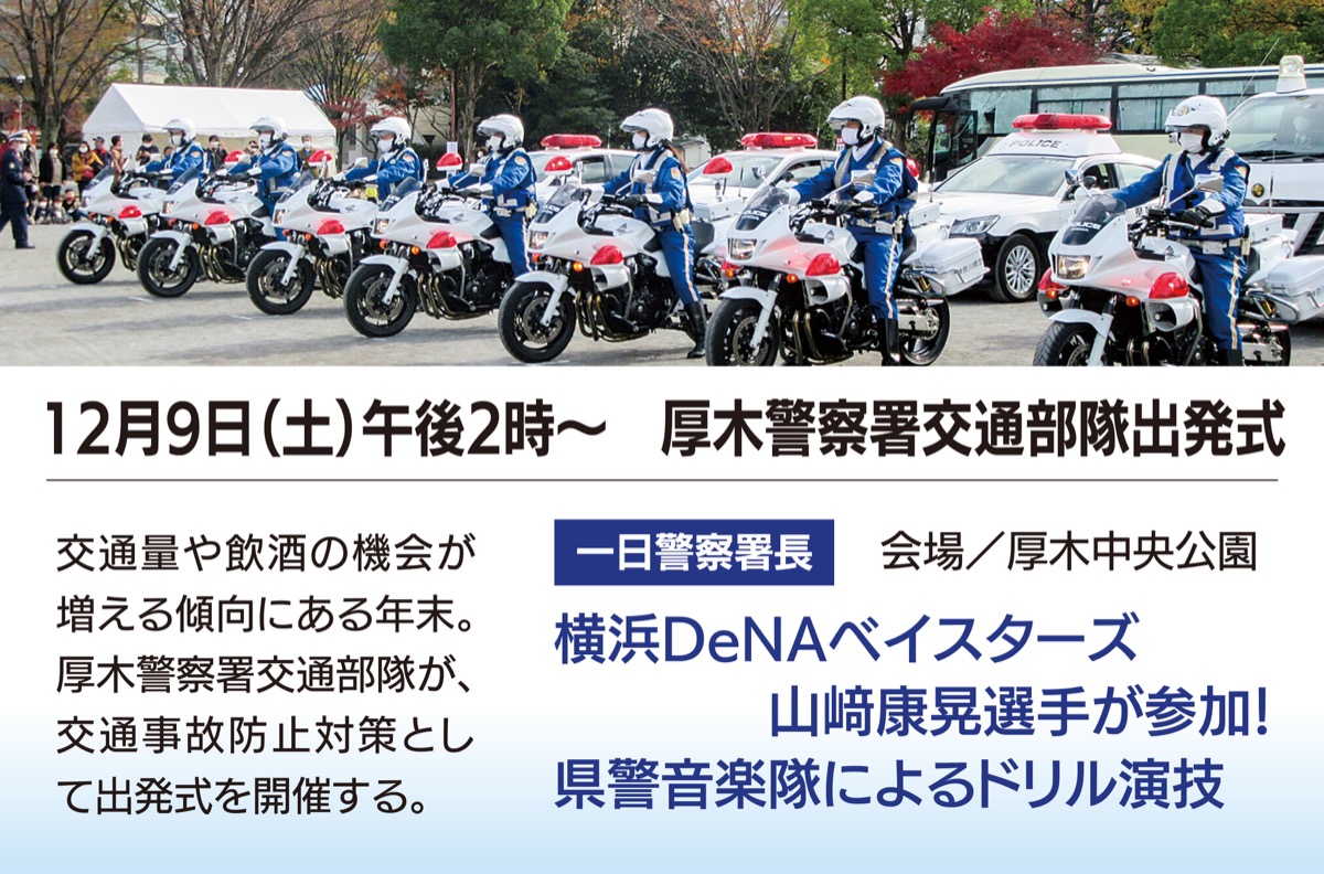 幅広く交通安全の啓発活動を行う交通安全協会の笹生会長は「交通安全指導員をはじめ、多くの方のご協力を頂いている。12月は飲酒運転根絶のための呼び掛けに力を入れています。残念ですが、大事故につながっていないだけで飲酒運転をするドライバーはいます」と語る。12月1日には本厚木駅前の飲食店を回り、飲酒運転撲滅を願ってハンドルキーパー運動を呼びかけた。同会では特に年末年始に強化するという。