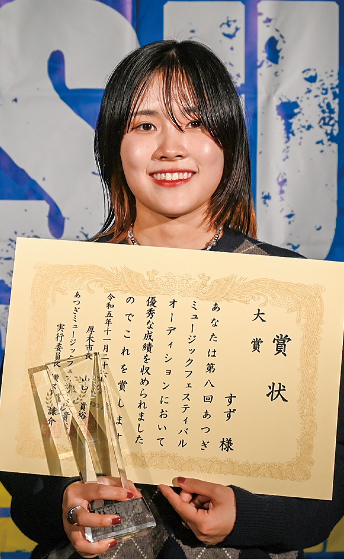 すずさんは市内のミュージックスクールに通うシンガーソングライター。『自分の想いを音楽で伝えること』をモットーに音楽活動をする。大賞を獲得し「すごく嬉しい気持ちでいっぱいです。やっとスタートラインに立つことができました。ラジオやフェス出演、ワンマンライブなどの目標を、音楽と向き合い一つひとつ叶えていきたいと思います。厚木から世界へ。この言葉を叶えられるように頑張ります」とコメント。今後は同レーベルのプロデュースでメジャーデビューに向け活動を行う。