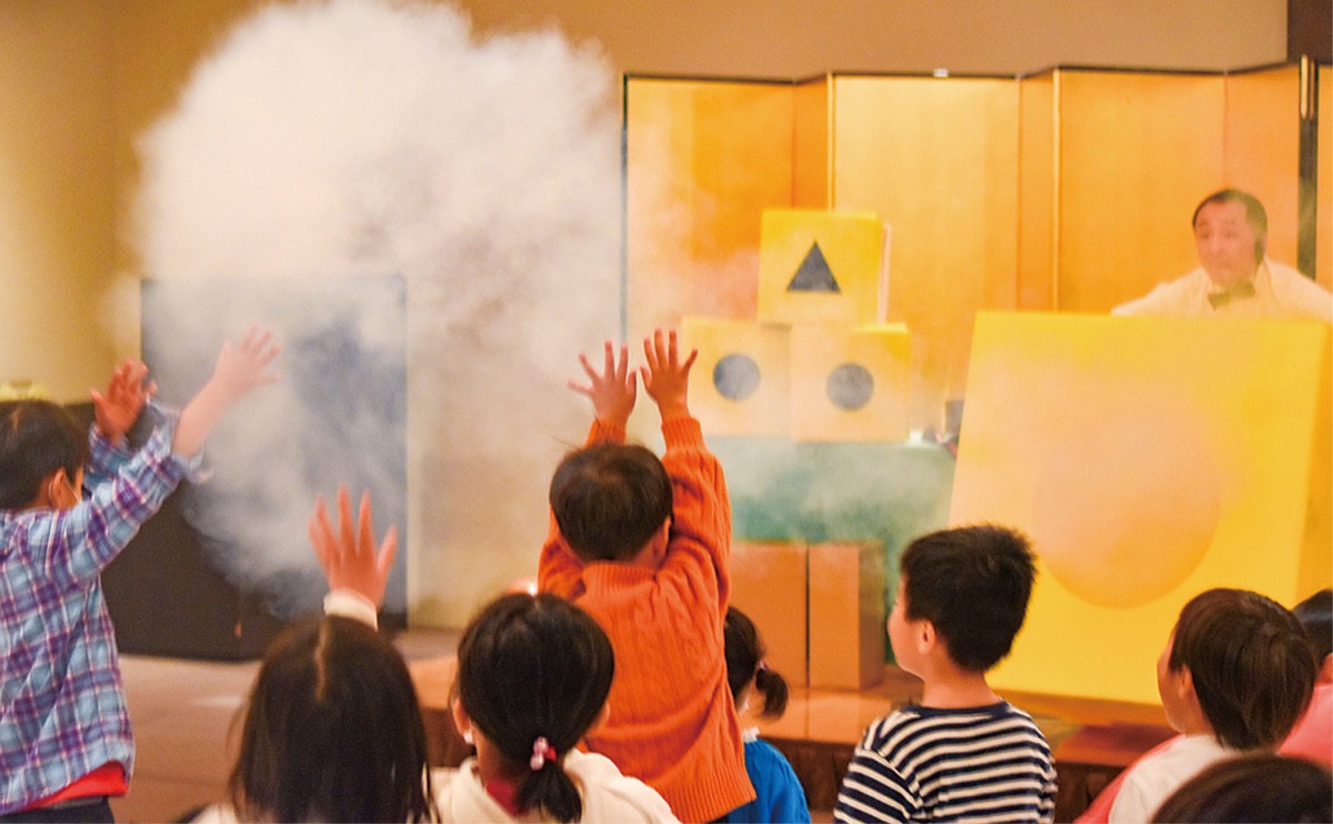 浅草の漫才協会の芸人、青空ピー介さん・プー子さんによるサイエンスマジックショーで、ゴム手袋や風船で科学の仕組みを面白おかしく披露。煙をためた大きな箱をピー介さんが叩くと、丸い穴からドーナツ型の煙がふわり。子どもたちはジャンプして受け止め、追いかけたりと会場は歓声に包まれた。