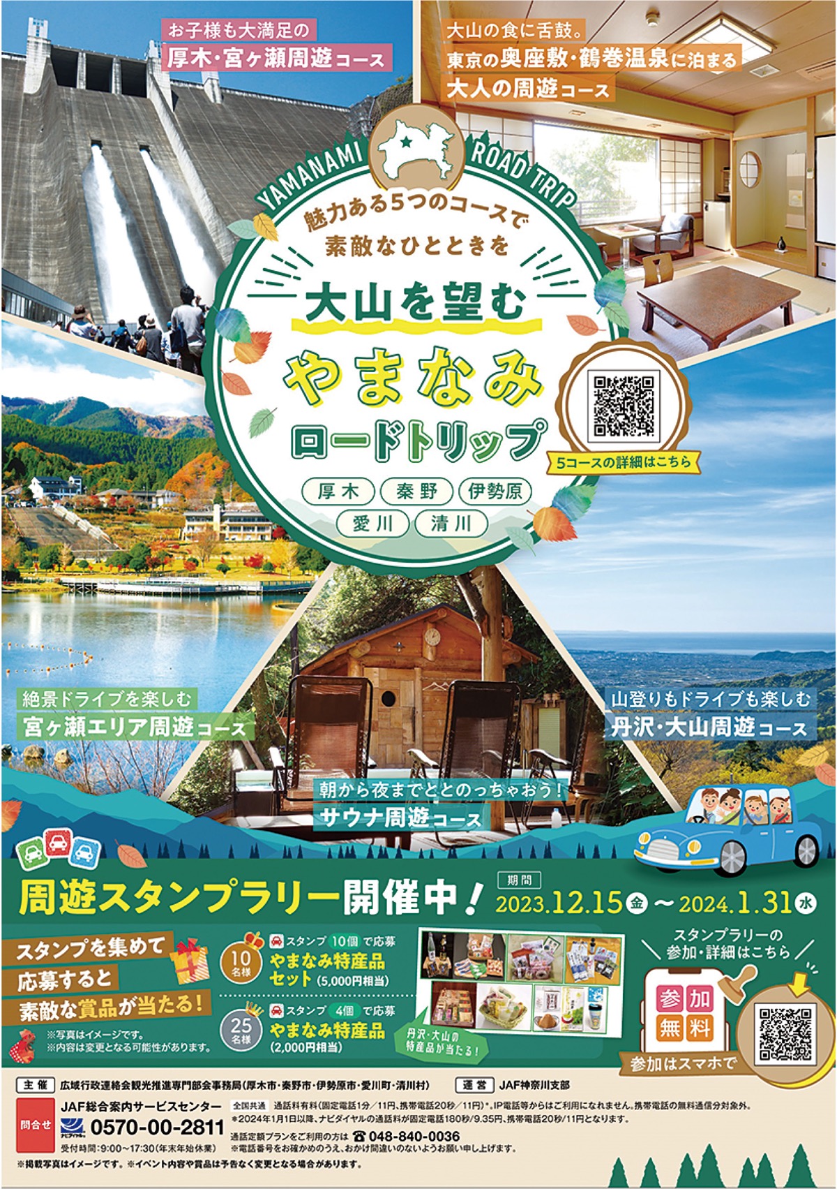 厚木市や愛川町、清川村、秦野市、伊勢原市による新たな広域連携の取り組みとして、5市町村の観光資源をマイカーで巡る「大山を望むやまなみロードトリップ」が完成した。12月中旬からウェブ上で公開しており、1月31日(水)までの間、特産品がもらえるスタンプラリーも実施している。