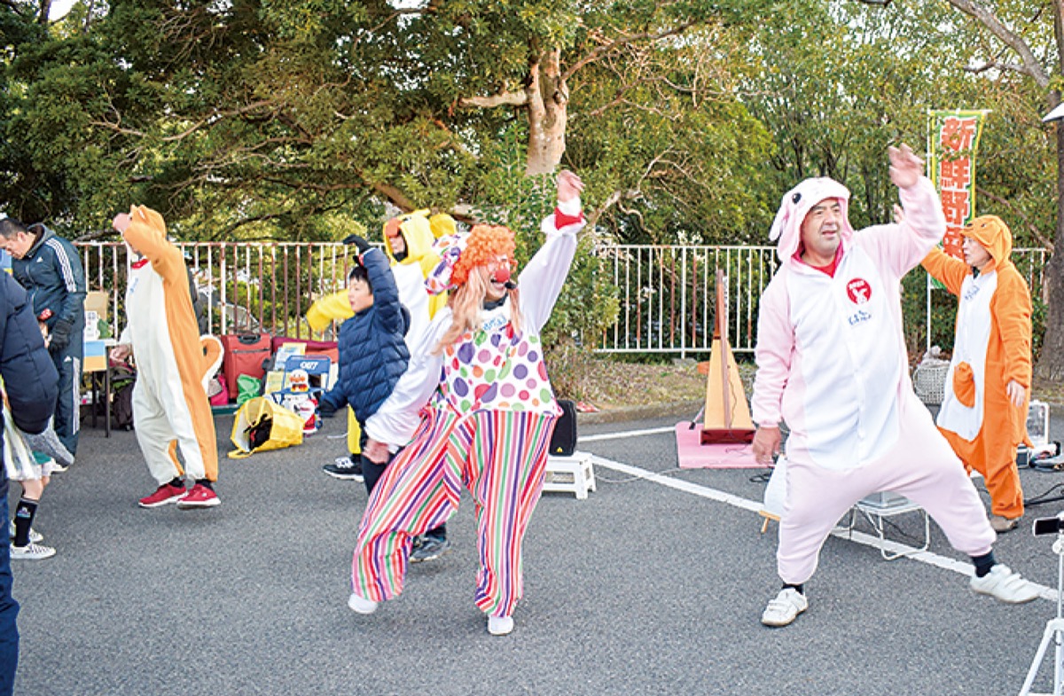この日は、あゆコロちゃんも登場。野菜など食材等を求めて地元住民らが訪れた。市内在住のパフォーマー西田由花里さんと仲間たちのミニコンサート等もあり、子どもたちも喜んだ=写真。関係者は「会場内は大いに盛り上がり、皆さんの笑顔が見られて良かった」と話した。