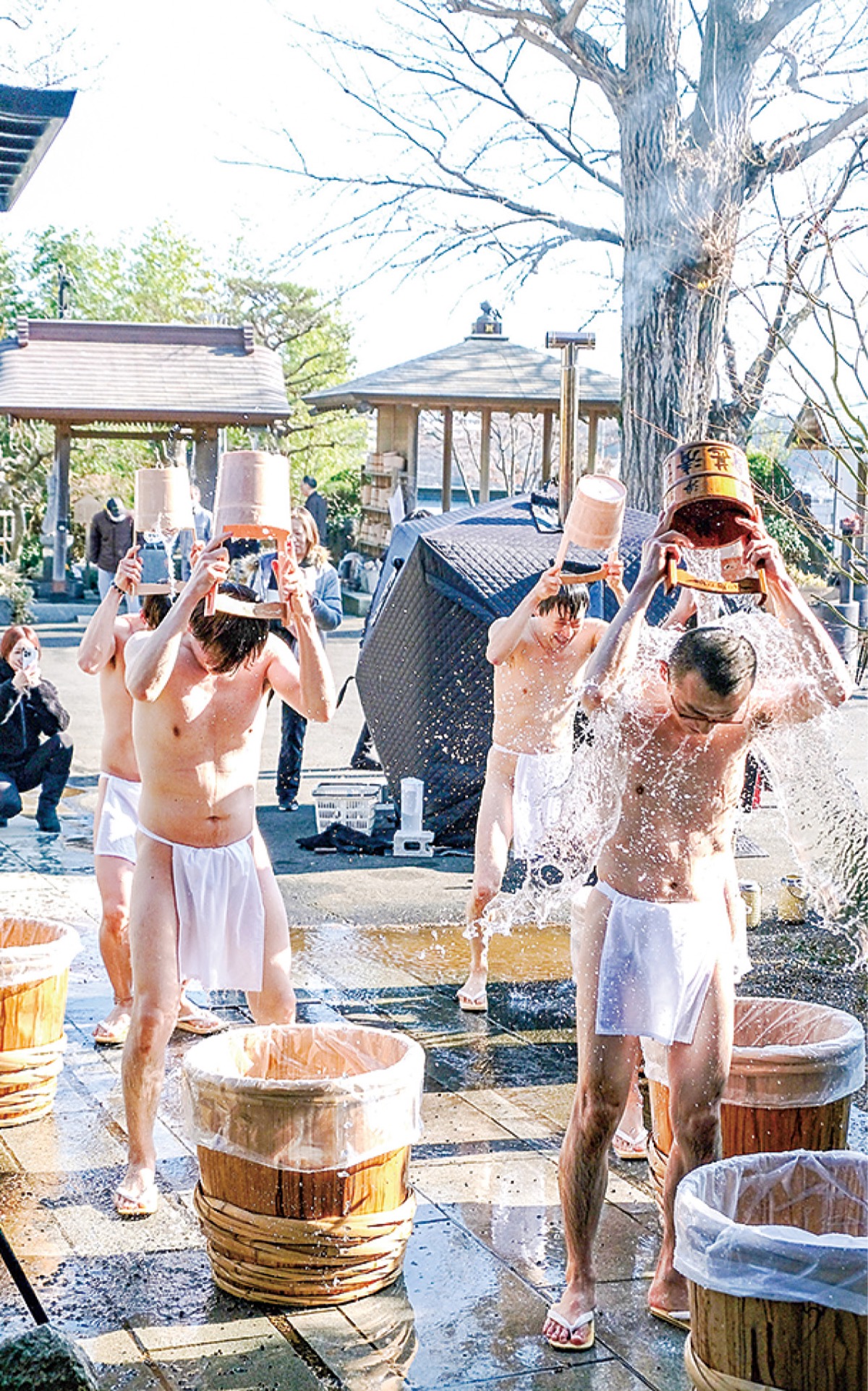 煩悩を払う願いを込めた水行が、下古沢の日蓮宗本照寺で12月30日に行われた。過酷に見える水行だが、実は屋外テントサウナで温まった直後。かぶった瞬間参加者から「ひゃー」と声が上がったが心地良さげだった。