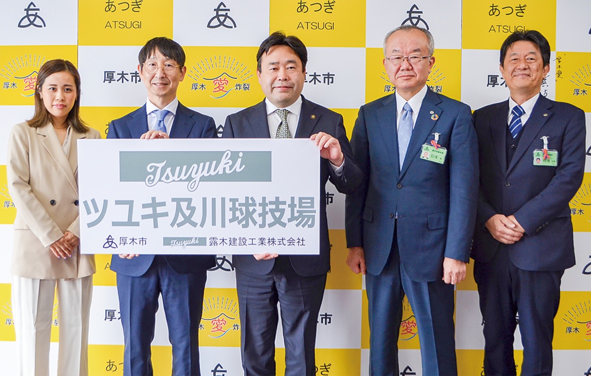 厚木市は、厚木市営及川球技場のネーミングライツ契約を露木建設工業株式会社(酒井幸治代表取締役社長・本社/横浜市青葉区)と締結し、1月11日に厚木市役所で記念式を行った。契約期間は2024年4月1日から2027年3月31日までの3年間で、契約金額は年額100万円。新たな名称は「ツユキ及川球技場」となる。
