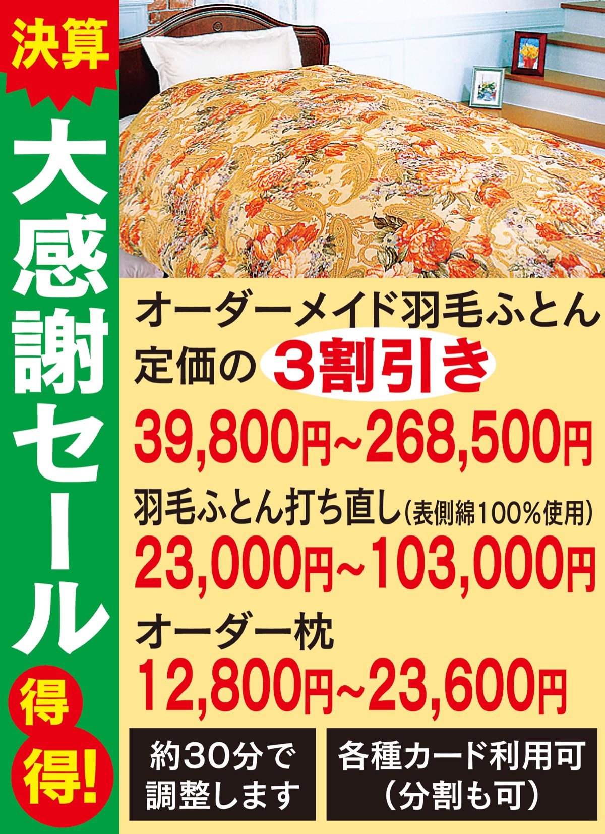オーダーメイド羽毛ふとんやカシミヤ、キャメル、ウール毛布、真綿ふとんやふとんカバー、シーツ、パジャマ、今治タオル、人気の手作りはんてんなど、最大半額で購入可能。もうすぐ春、このチャンスにベッド周りを一新してみては。