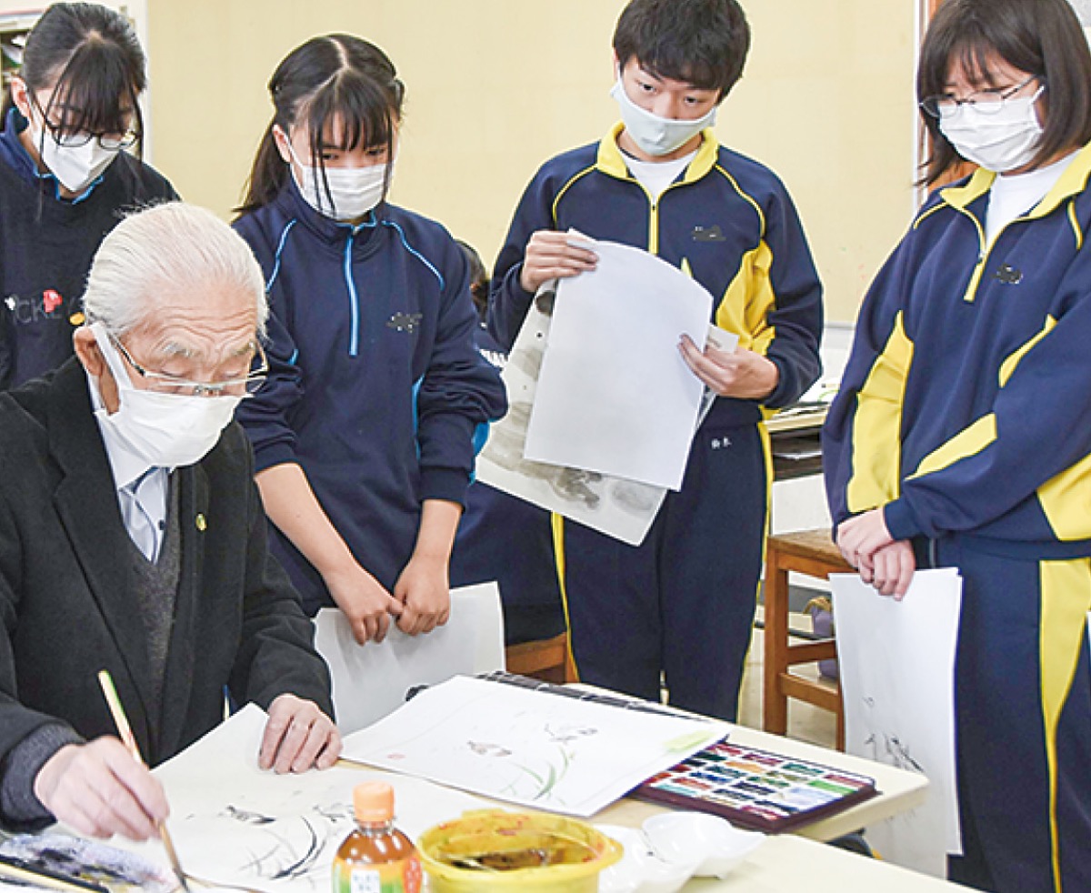 厚木市の睦合東中学校(重久昭彦校長/三田)の美術部が1月27日、地域で水墨画教室を開く又村和夫さん(90歳・妻田西)に水墨画の指導を受けた。