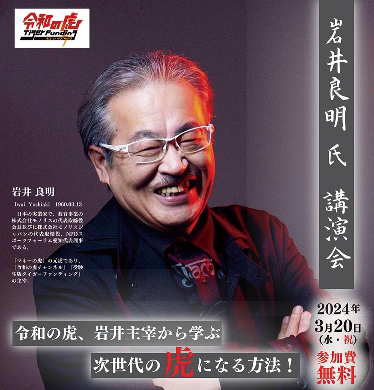「令和の虎」こと岩井良明氏の講演会『次世代の虎になる方法』が3月20日(水・祝)、厚木商工会議所大会議室で開催される。午後5時半から7時半まで。参加無料。