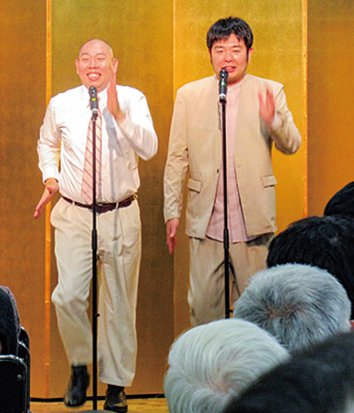 町社会福祉協議会が主催したもので、レクリエーション介護士と健康ウオーキング指導士の資格を持つお笑い芸人の「レギュラー」の2人が介護の話をテーマに講演。「介護というと全てをやってあげることと考えがちですが、自立支援をすることが大切です」と呼び掛けた。