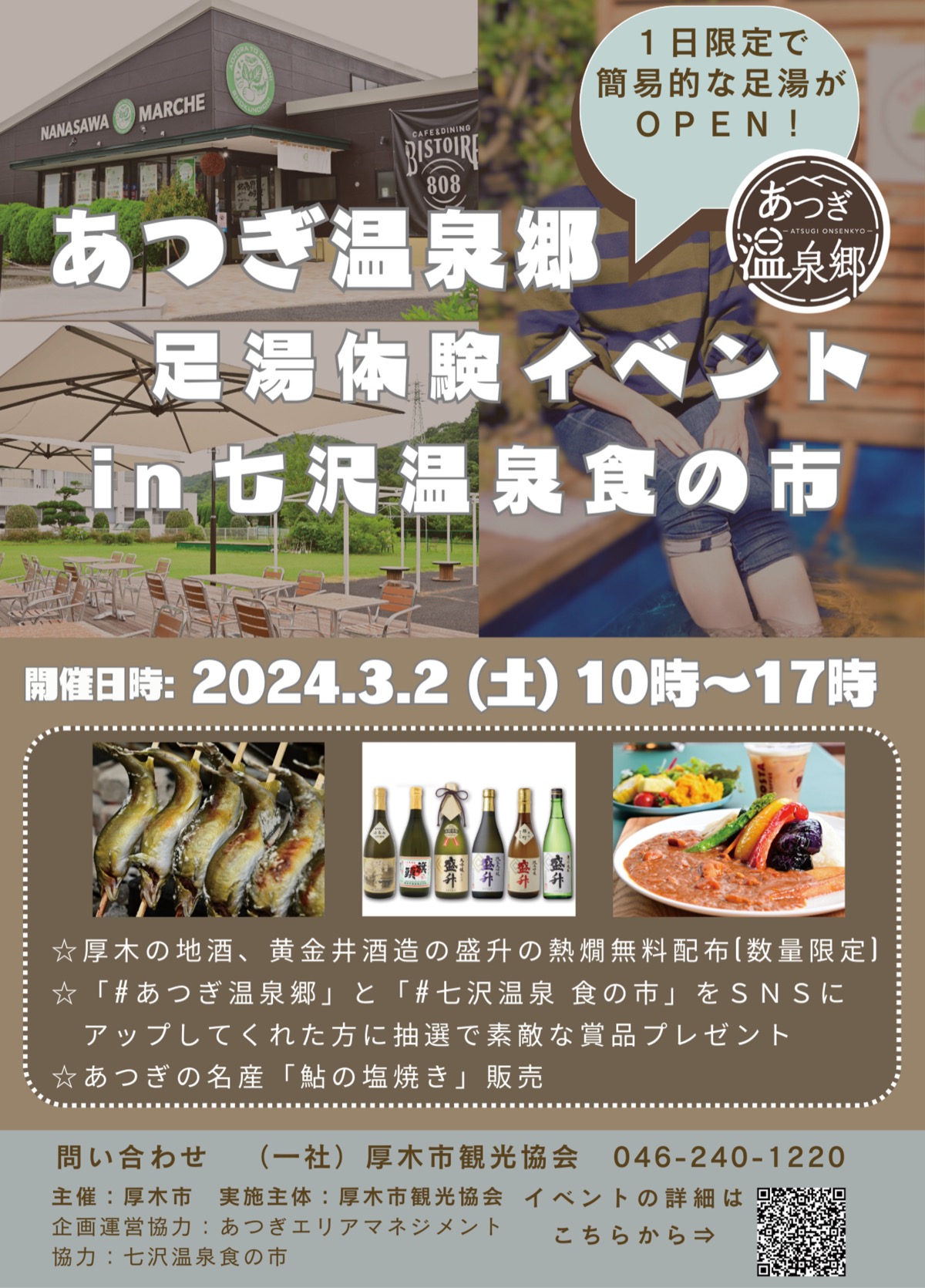 市内温泉地の新名称「あつぎ温泉郷」を広く周知しようという企画で、当日は足湯体験のほか、観光パンフレットなどの配布や鮎の塩焼き、地酒等市内名産・特産品の販売も行われる。