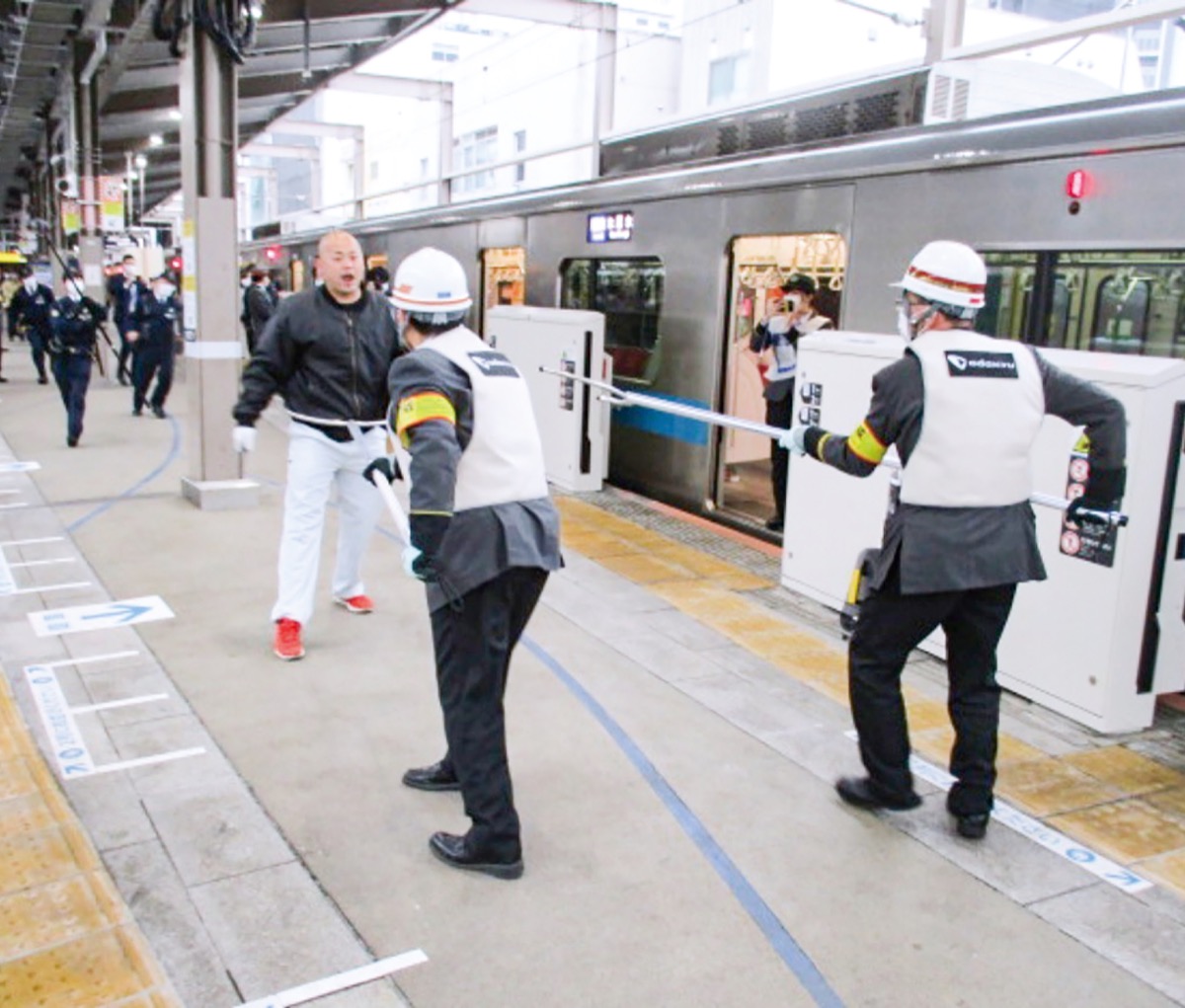 刃物を振り回しながら降車する犯人役の男性を、駅員と警察官が連携して制圧。