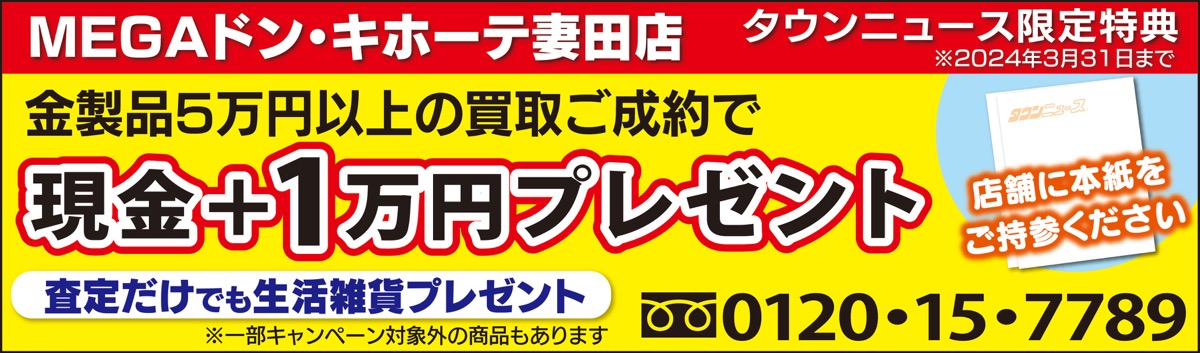 国道246号線沿いの「ドン・キホーテOUTLET館」2階にある買取専門店「おたからやMEGAドン・キホーテ妻田店」は、金製品の買取成約金額が5万円以上の場合、買取金額に上乗せして現金1万円を進呈する。期間は3月末まで。