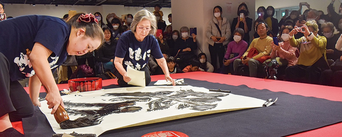 揮毫の際は大勢の来場者が見守る中、金澤さんは極太の筆で打ち込むように書き、さらに愛するマイケル・ジャクソンのダンスを披露。この作品を前に母の泰子さんは「翔子がダウン症と告知された時は涙に暮れ絶望の中にあったが、生きてさえいれば何が待ち受けているか分からない。絶望なんてない」と語り、山口貴裕市長は「思いがこもった愛の字。市民とともに厚木愛を育んでいきたい」とコメントしていた。