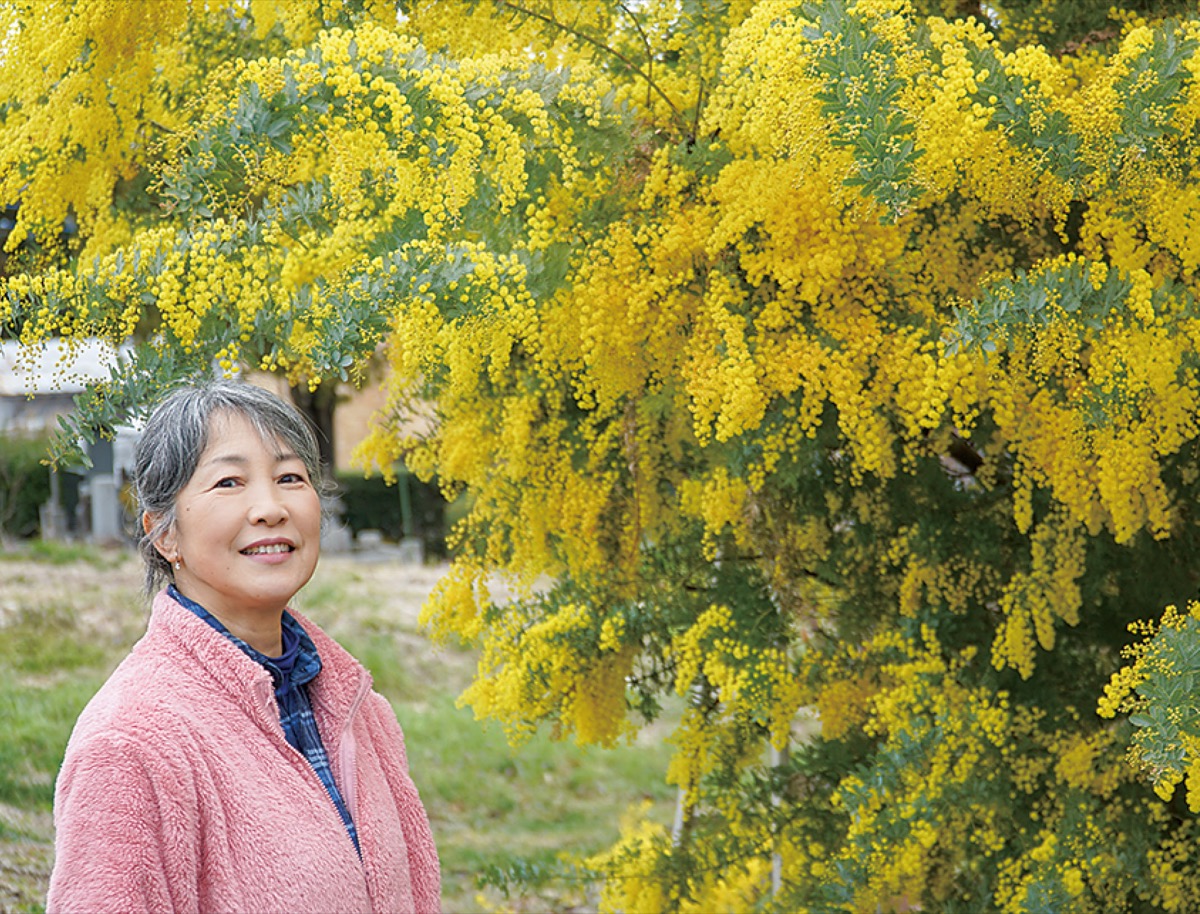 半原で「ハーブ&アロマ ねむねむうさぎ」ワークショップルームを開く平山裕子さんのガーデンファームで、今年もミモザが花を咲かせた。平山さんは自分の背丈(163cm)を超える藪だらけの休耕地を、ガーデンファームとして夫と2人で5年前から開墾。ミモザは4年前に自宅の庭に植える予定だったものをガーデンファームの方が広いからと移植した。「誰でも自由に出入りできるオープンガーデンなので、ご自由にご覧ください。駐車場はないので路上駐車はご遠慮ください」と話す。3月中旬までは見ごろ。詳細は「ハーブ&アロマ ねむねむうさぎ」で検索を。