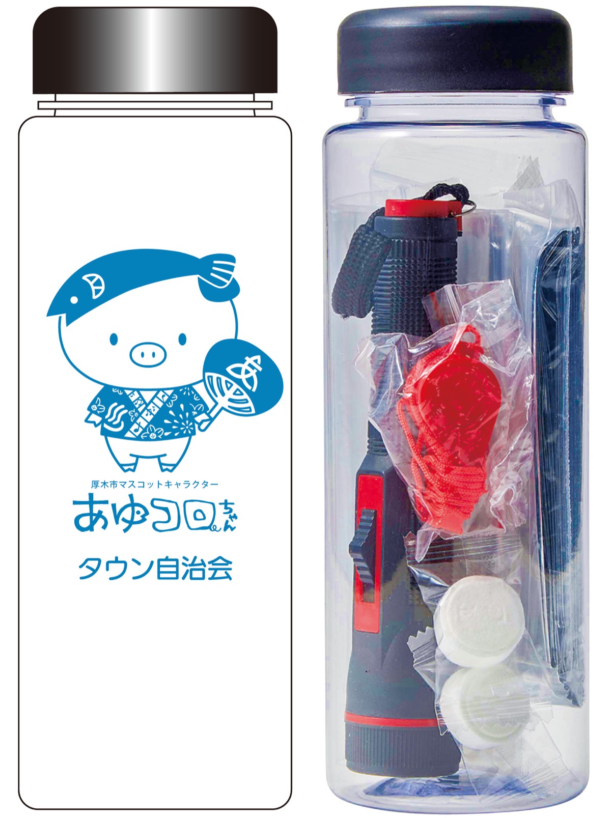 元日に石川県能登地方を襲った最大震度7の「能登半島地震」。災害はいつ、どこで発生するか分からないという事を再認識し、備えの見直しが重要となっています。タウンニュース社では、災害時に役立つグッズをまとめた「防災ボトル」に厚木市イメージキャラクター・「あゆコロちゃん」のイラストと希望する団体名を印刷できるオリジナル品の取り扱いを開始しました。