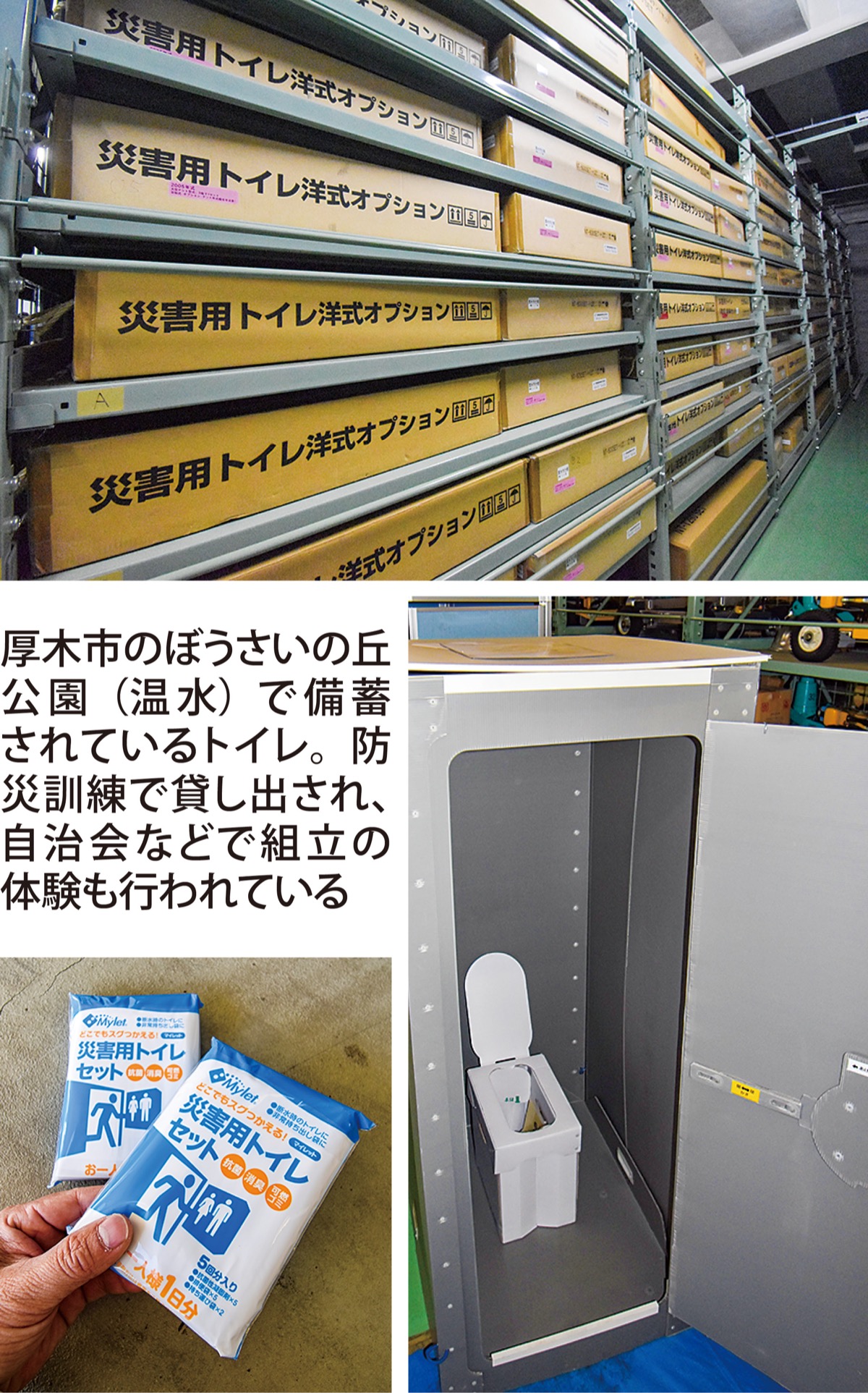 厚木市では都心南部地震の避難者約1万8千人の想定をもとに備蓄を進めている。最も数が多いのは携帯トイレで、凝固材やビニール袋からなり、9400回分を備える。組み立て式の上屋構造に段ボールやポータブル型のトイレを組み合わせた簡易型は8万2千回分を備蓄し、不足の場合はメーカーから提供される仕組み。仮設トイレは市環境みどり公社との提供協定を結んでいる。マンホール上に設置して使うテント・便座セットのトイレは106基。また災害時だけ便座を付けて使う下水道直結の地下構造も厚木小、厚木第二小、厚木中、広域避難場所の荻野運動公園に計34基備えている。駅周辺の小中学校に集中して設置されているのは、災害で帰宅困難者が発生した場合を想定したものだ。