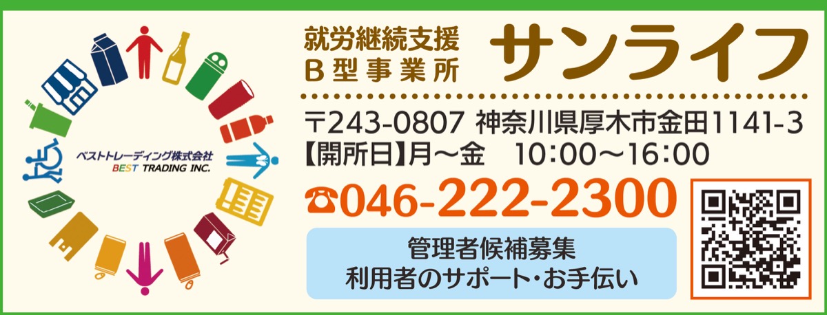 プラスチックやペットボトルなどの回収で、循環型社会の一助を担う厚木市金田にあるベストトレーディング株式会社。同社は、障がい者が生き甲斐を持って健常者と同等に活躍できる職場作りや就業力の向上支援に努めている。就労継続支援B型事業所「サンライフ」が併設され現在、新規利用者を募集する。