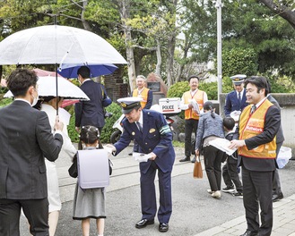 厚木市内の学校で入学式が行われた4月8日、厚木小学校(清水良校長)で、新入学児童に交通安全を呼びかける啓発運動が行われた。