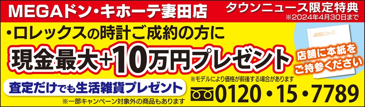 4月末までは腕時計・ロレックスの買取も強化中で、買取成約で買取金額と別に最大で現金10万円を進呈している。「動かなくなってしまった、ガラスが割れてしまった時計でも大丈夫です。査定だけでも大歓迎です」とスタッフ。場所は国道246号線沿いにある「ドン・キホーテOUTLET館」2階。店頭・出張ともに査定は無料。駐車場は無料。まずは電話で来店・出張予約を。