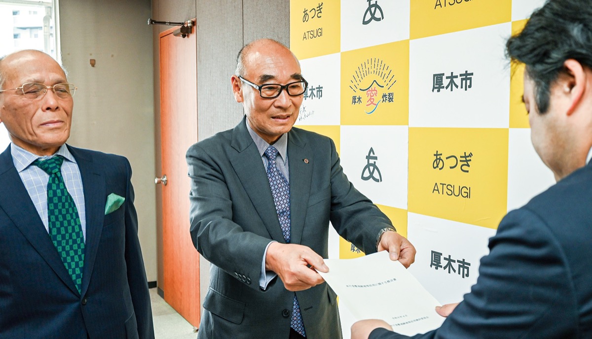 厚木市本庁舎敷地跡地等活用検討委員会(委員長/中村幹夫厚木商工会議所会頭)が4月12日、市役所本庁舎で厚木市に提言書を提出した。
