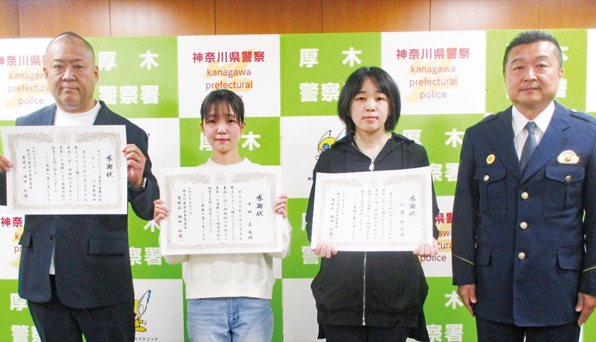 特殊詐欺の被害を防いだ厚木市内のセブンイレブンの店舗関係者に、厚木警察署(横田和道署長)から5月2日に感謝状が贈られた。