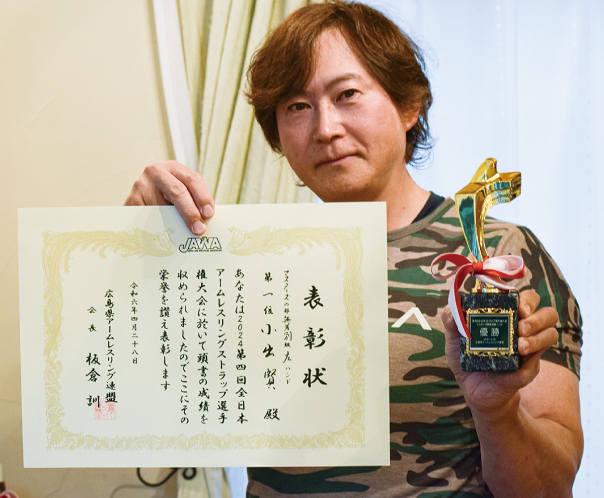 4月28日に広島県福山市で開催された「JAWA2024全日本アームレスリングストラップ選手権大会」に、愛川町半原在住の小出賢さん(54)=人物風土記に関連記事=が出場。マスターズの部・無差別級レフトハンドで優勝した。
