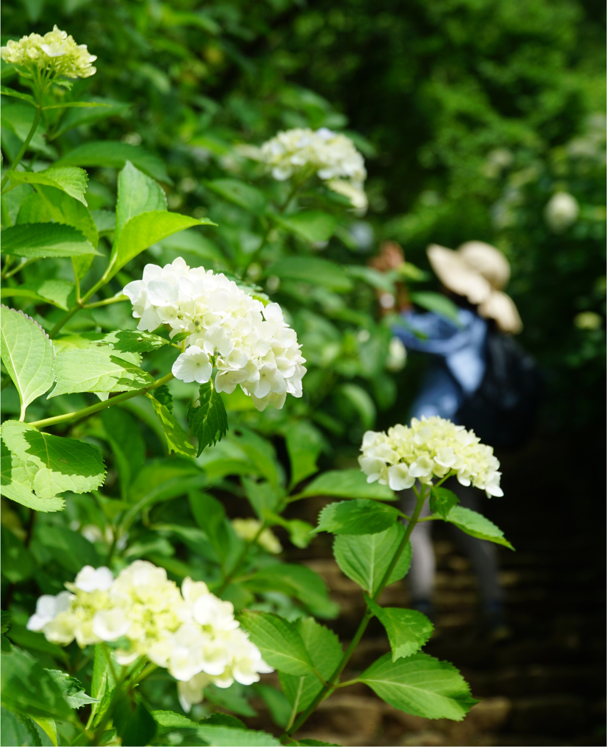 県立七沢森林公園北側のさくら園にある「森のあじさい階段」で、白いアジサイが咲き始めた。