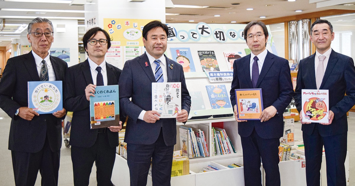堀会長は「人生100年時代に向け、幼いころから歯の健康を守ることを啓発していきたい。日ごろから歯科健診で協力を得ている市にも感謝している」と話した。山口貴裕市長はそれを受け、「幅広い世代に向けた図書を寄贈していただきありがたい。今後も連携して口腔ケアの充実を図れたら」と伝えた。