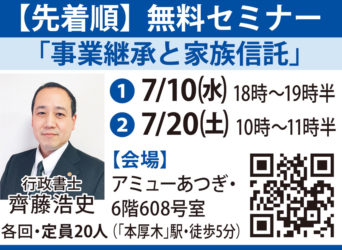 経営者と後継者のためのセミナー「事業継承と家族信託」がアミューあつぎの6階・608号室で開催される。7月10日(水)午後6時〜7時30分と、7月20日(土)午前10時〜11時30分の2回で、各回とも同一の内容。