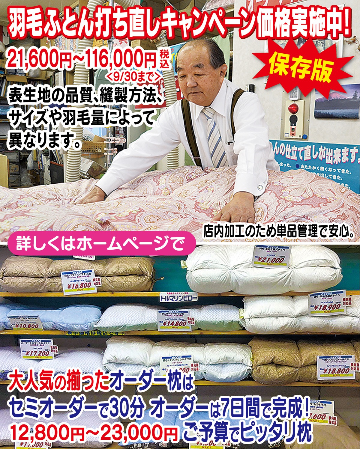 秋冬に備えて、今のうちに汚れや破れ、へこんだ羽毛ふとんの手入れを済ませるのがベスト。使用中の羽毛ふとんが良く眠れるふとんに変身する。39年前から店内に羽毛ふとん製造機を常設し、店主がプロの技でリフォーム(打ち直し)を手掛けている実績で高品質の羽毛ふとんに仕立て上げている。