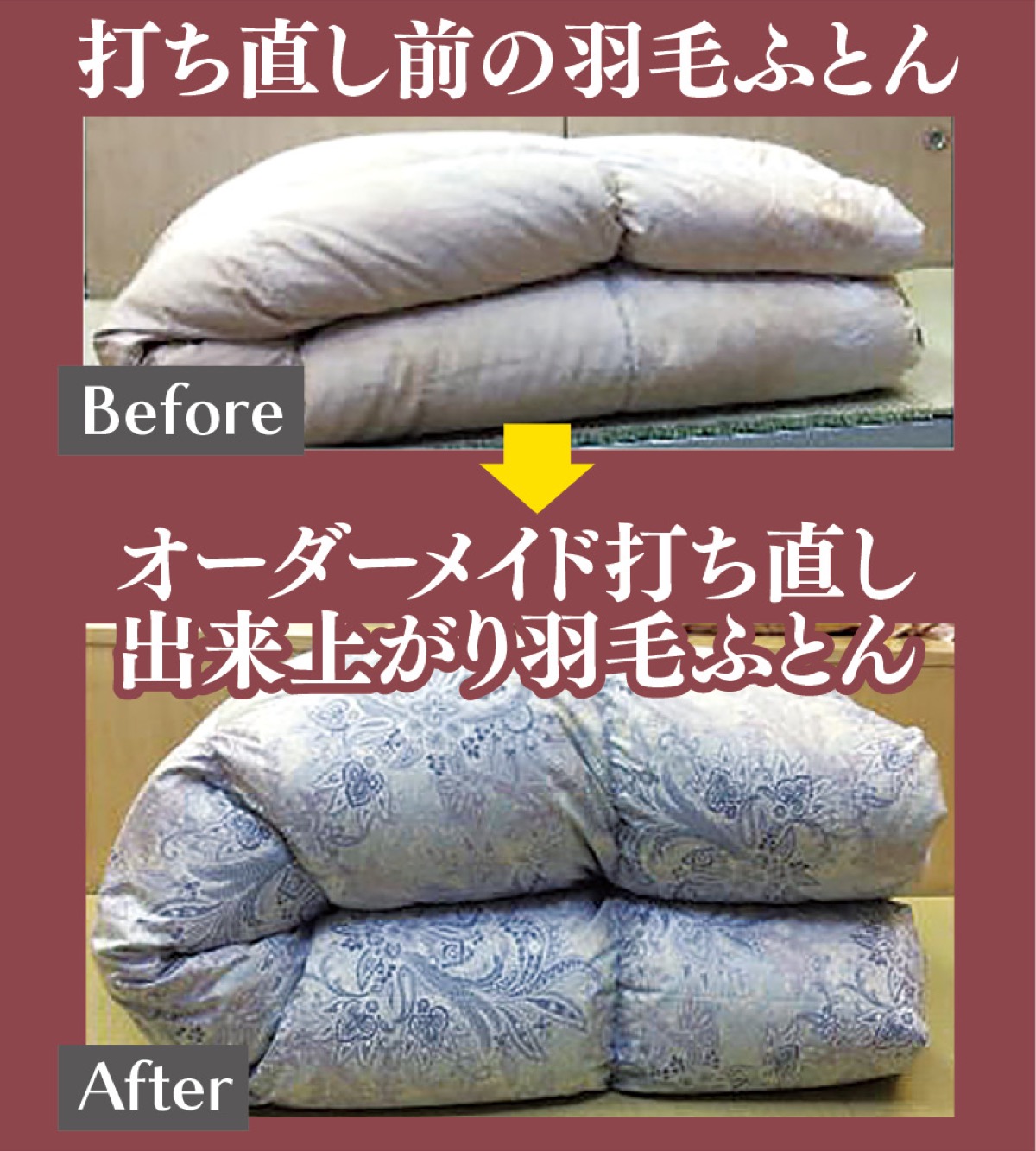 オーダーメイド打ち直しは『表生地の軽さ、色柄、縫製方法、足し羽毛の品質、羽毛量』が自由で長期間使える軽くて温かいふとんに変身。納期は1カ月程。木綿や羊毛ふとんの打ち直し、ふとん丸洗いも受付。