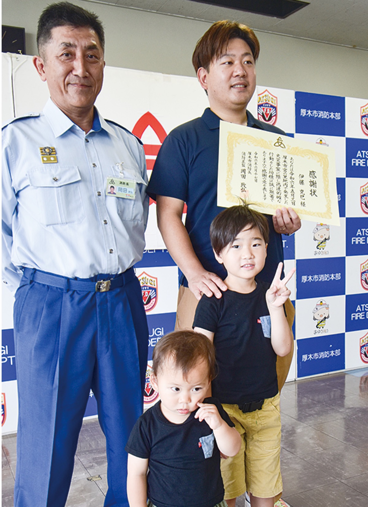 厚木市消防本部が6月17日、火災の延焼を防いだ会社役員の伊東克巳さん(36)に感謝状と記念品を贈った。