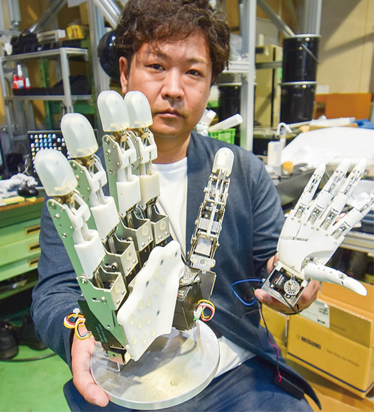 座間市のダブル技研(株)は人の手のように動くロボットハンドを開発した。2年ほど前に他の研究機関の人型ロボットに接続し、国際的なコンテストに出場、決勝に進んで注目を集めた。握手した感覚は人間の手にそっくりだ。5本指が個別に動くタイプもあり、工場などで人が使う工具をそのまま扱える。「人体に近づく開発なだけに、そのすごさに驚きます」と和田始竜専務は話す。