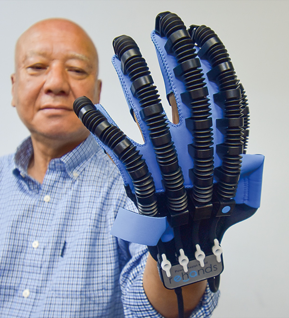 その第1号が、(株)エルエーピー(厚木市)の「パワーアシストハンド」だ。脳梗塞などで拘縮した手に装着し、空気圧で動く仕組みで、自宅で繰り返しリハビリできる。神奈川工科大(厚木市)の故・山本圭次郎博士の特許技術から開発され、市内の病院で使ってもらい、現場の声を活かした。商品化後もユーザーからは「新聞がめくれるようになった」「箸が持てる」という声が寄せられている。現在はより安価で着けやすい品へと改良が続いている。