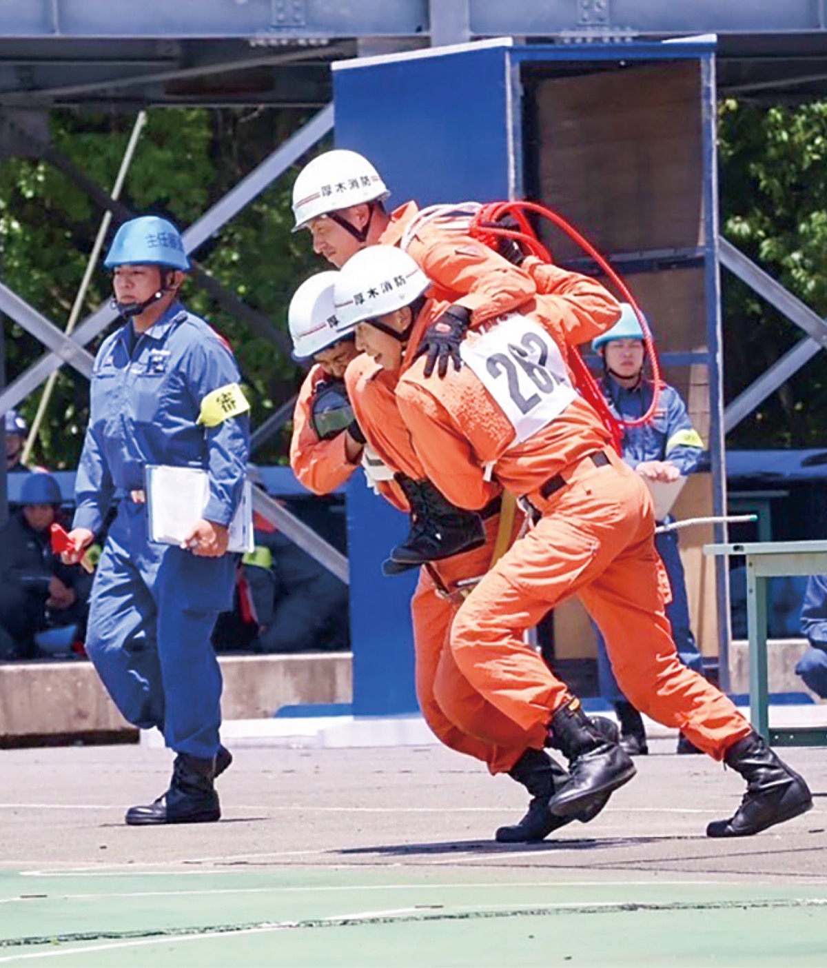 チームを組んだのは、長井涼太さん(28・温水西在住)、神崎拳さん(27・上荻野在住)、要救助者役の志村知哉さん(33・宮の里在住)の3人。34チームが出場する中で2位と0・6秒差の37秒3を記録し1位となり、厚木市消防として同種目では12年ぶりとなる全国出場を果たした。