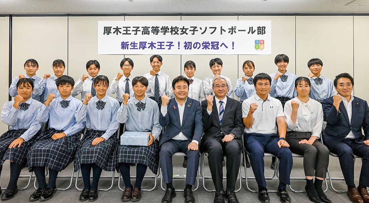当日は選手13人をはじめ、学校長、監督、後援会長などが出席。山口市長は「県大会優勝おめでとうございます。皆さんが力を出し切り今回の結果につながったと思います。全国大会でも頂点を目指して頑張ってください」とコメント。主将の渡邊まひろ選手は「一戦一戦を全力で戦い、優勝できた。厚木王子高等学校のユニホームを着て初めての全国大会。チーム一丸で勝利をめざしたい」と話した。