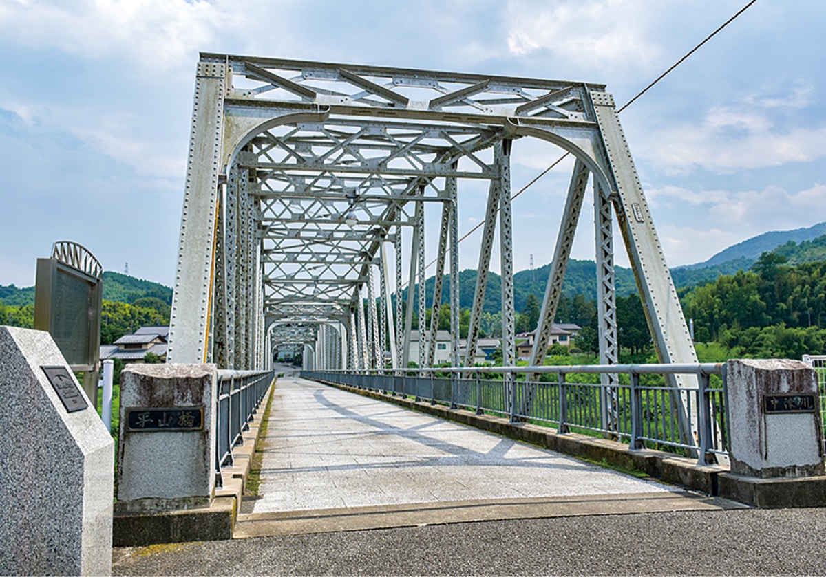 3連からなる平山橋は1913(大正2)年、左岸側の1連のみが鋼橋、残りの2連が木橋として建造され、1926(同15)年に総鋼橋造りとして完成した。橋長は112・71m、幅員4・5m。リベット構造の鋼橋は全国的にも希少とされ、2004年には国登録有形文化財になった。