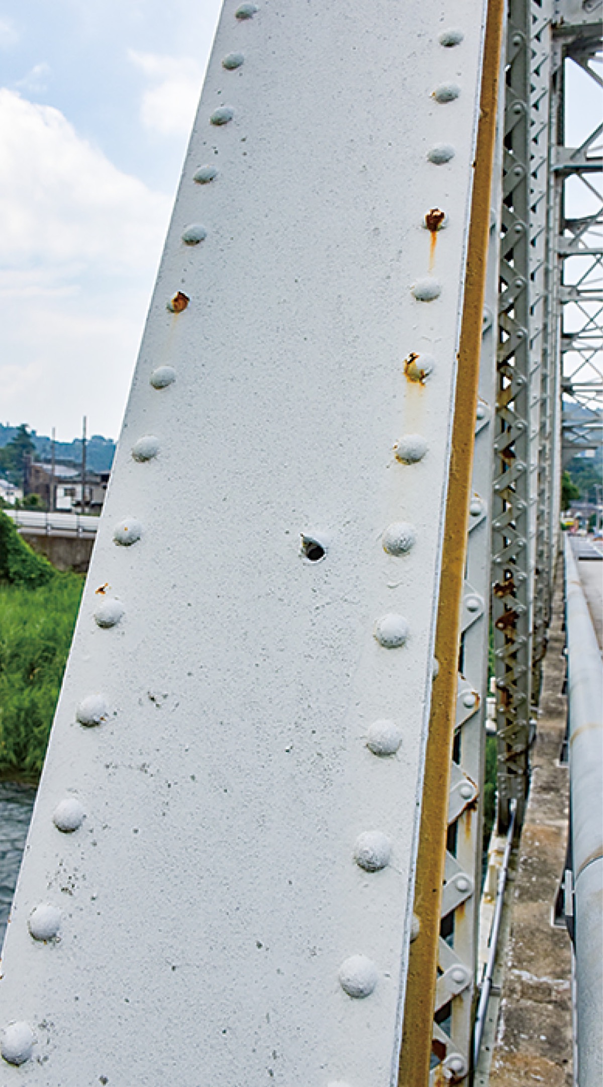 橋の欄干や柱を注意深く観察しながら橋を歩くと、所々に直径1cmほどの穴が開いているのが分かる。米軍機の機銃掃射によるものとみられる弾痕だ。